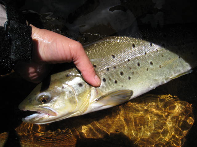 朝一、百貫付近でミノーを水面でちょこちょこやってると45~50位のブラウンが現れ、