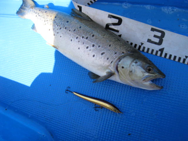 45cmのレインボー。サービスさんだけど、ヒレも回復しはじめた奴で跳ねる跳ねる。