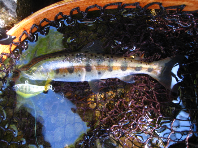 その後、数投で塩焼きサイズのニジマスが。